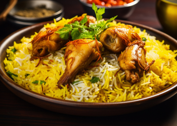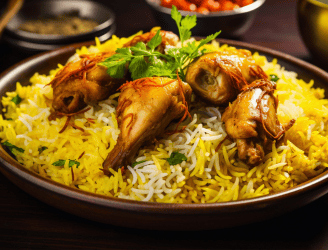 Each grain of basmati rice is infused with aromatic spices, mingling perfectly with tender chicken pieces that have been marinated to perfection. The biryani is layered with saffron and garnished with caramelized onions, fresh coriander, and a sprinkle of mint, creating a vibrant mosaic of colors and flavors.
